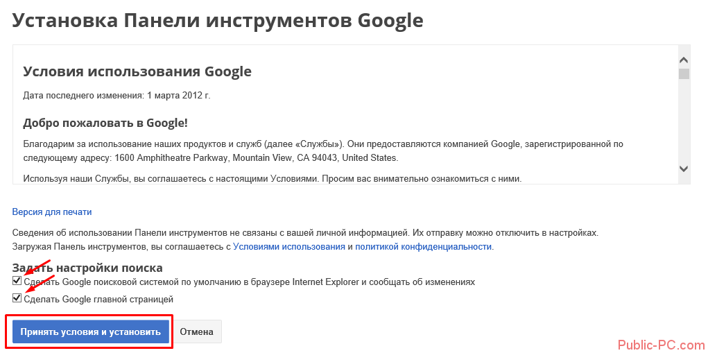 Принимаем условия и устанавливаем. Если хотите сделать гугл основным поиском, галочки можно не убирать.