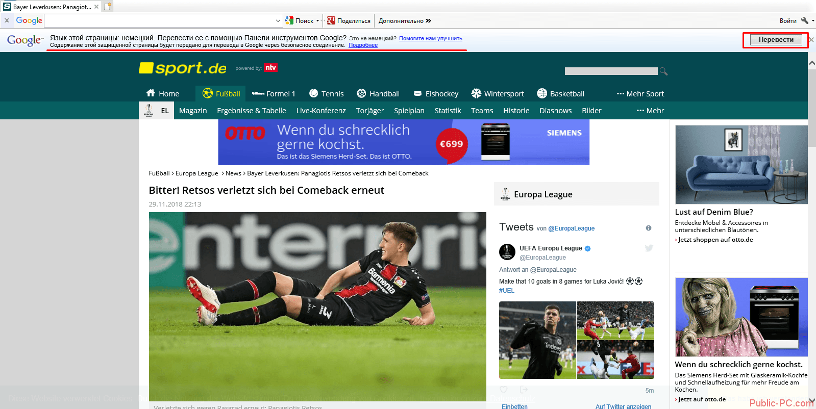 Для разнообразия переведем что-то на немецком языке. Зайдем на главную страницу известного спортивного ресурса. Видим, что установленный инструмент сразу определяет язык текста и предлагает его перевести. Нажимаем на иконку в правом верхнем углу.