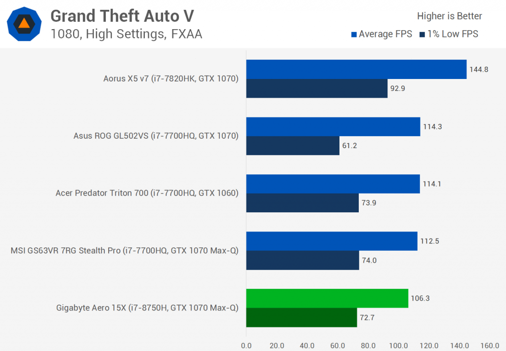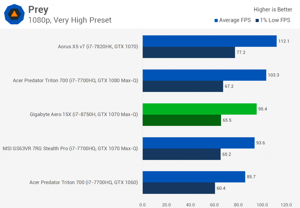 Несколько других игр на довольно типичных уровнях качества показали однозначные или даже нулевые улучшения производительности с 8750H. Например, Grand Theft Auto V выполнен с ошибкой системы 7700HQ с использованием высоких настроек, и это со средними кадрами, превышающими 100 FPS. Prey, которая производит 1% низкую цифру выше 60 FPS с использованием предварительной настройки Very High, не показала прироста производительности с 8750H.