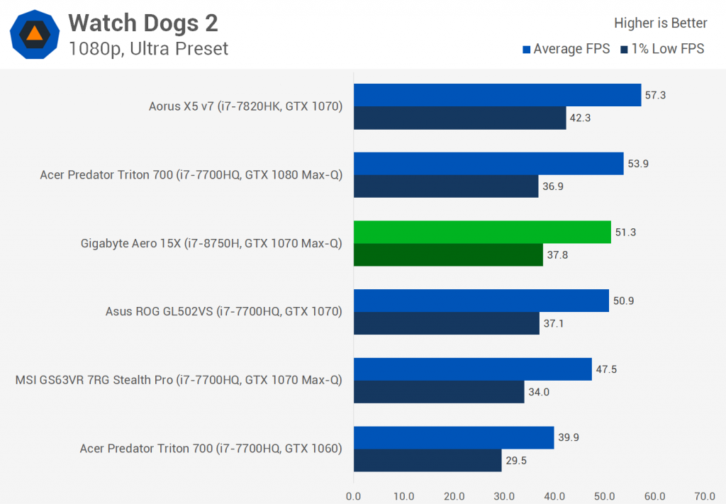 Watch Dogs 2, еще один титул Ubisoft, классно наказывает CPU. Здесь мы рассматриваем 8-процентный прирост в пользу 8750H по сравнению с 7700HQ в средних кадрах, который немного вырос до 11 процентов, глядя на один процентный минимум. Это использование предустановки Ultra, поэтому, если вы хотите изменить настройки до предустановки Medium, маржа увеличивается в среднем на 12 процентов, а 16 процентов — на 1%.