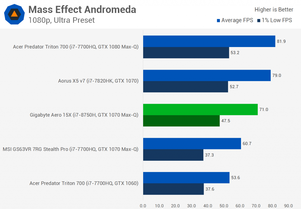 Удивительно, но Mass Effect Andromeda приносит пользу от более быстрого 8750H. Используя предварительную настройку Ultra quality на скорости 1080p, игра на 17 процентов быстрее в среднем с шестиядерным процессором и на 27 процентов быстрее, глядя на 1% низких результатов.