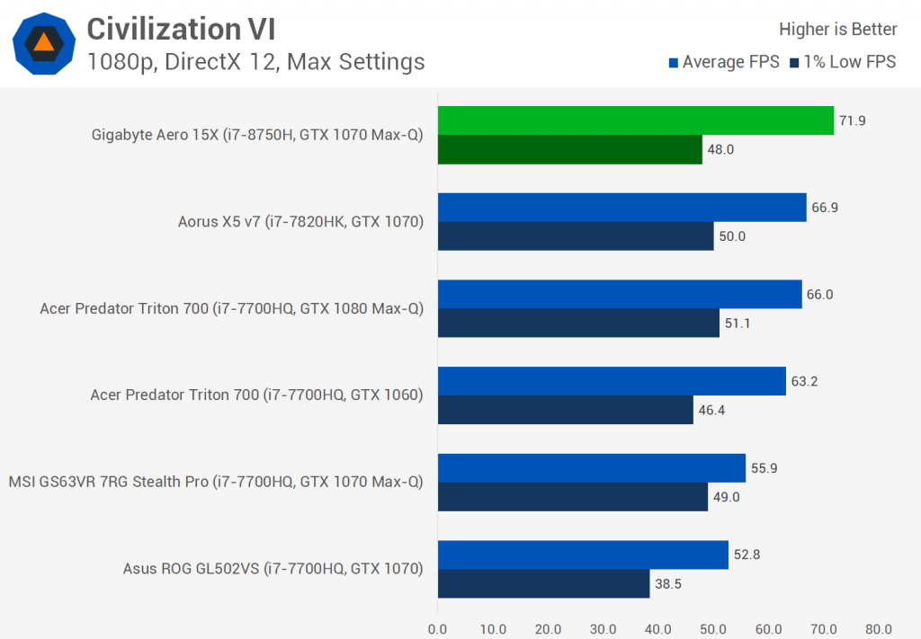 Давайте начнем с одной из самых больших игр с ограниченным количеством процессоров, с которыми мы тестируем: Civilization VI. Здесь 8750H обеспечивает достойное повышение производительности на 29 процентов при просмотре средних кадров, по сравнению с 7700HQ в ноутбуке MSI с тем же графическим процессором и конфигурацией памяти. Тем не менее, один процентные минимумы не приносят никакой пользы от дополнительной мощности процессора, поэтому «опыт» игры на новом процессоре 8-го поколения не обязательно выше.