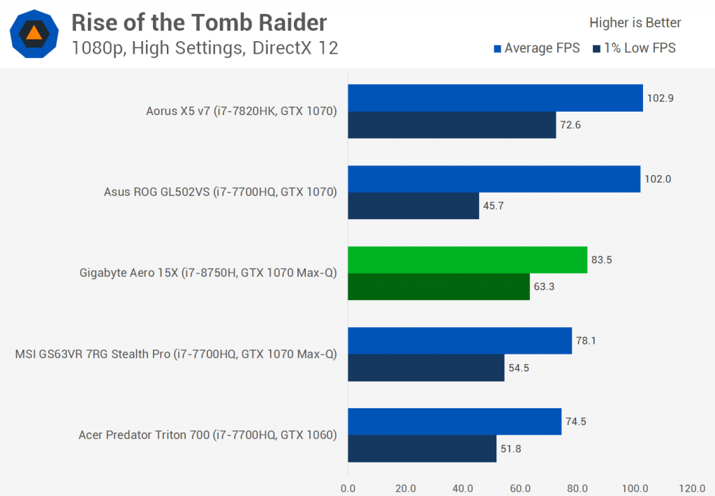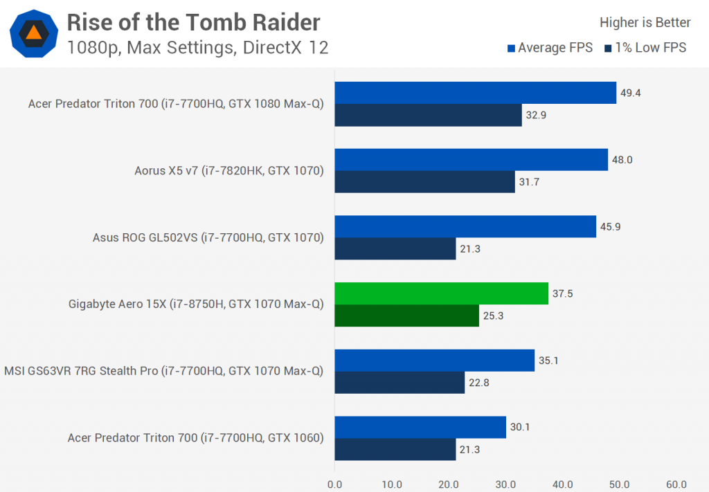 В некоторых играх пресет качества, который вы выбираете, определит, выиграете ли вы от дополнительной мощности процессора, по крайней мере, с GTX 1070 Max-Q. Если вы любите предустановку Ultra, вы увидите только повышение производительности на 11 процентов в Rise of the Tomb Raider, но если вы перейдете на High на 1080p, ожидайте на 16% лучше 1% минимумов.