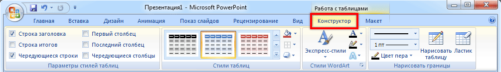 Для заполнения таблицы щелкаем по нужной ячейке и печатаем текст. Вверху, через закладку «Конструктор» (Работа с таблицами) можно изменить ее оформление.