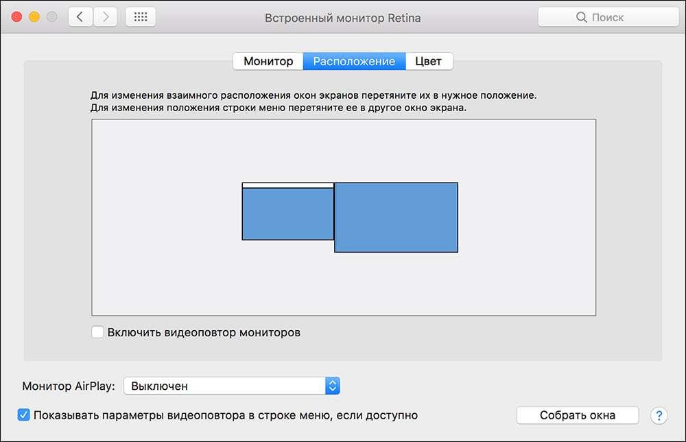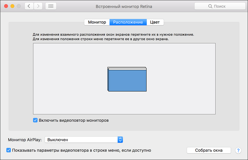 Этот режим наиболее востребован. Его суть предельно проста. На мониторе полностью дублируется изображение с дисплея MacBook. Этот тот самый вариант, который нужен для проведения презентаций и работы с проектором. Ограничением является то, что разрешение подключаемого экрана не может быть больше, чем у MacBook.