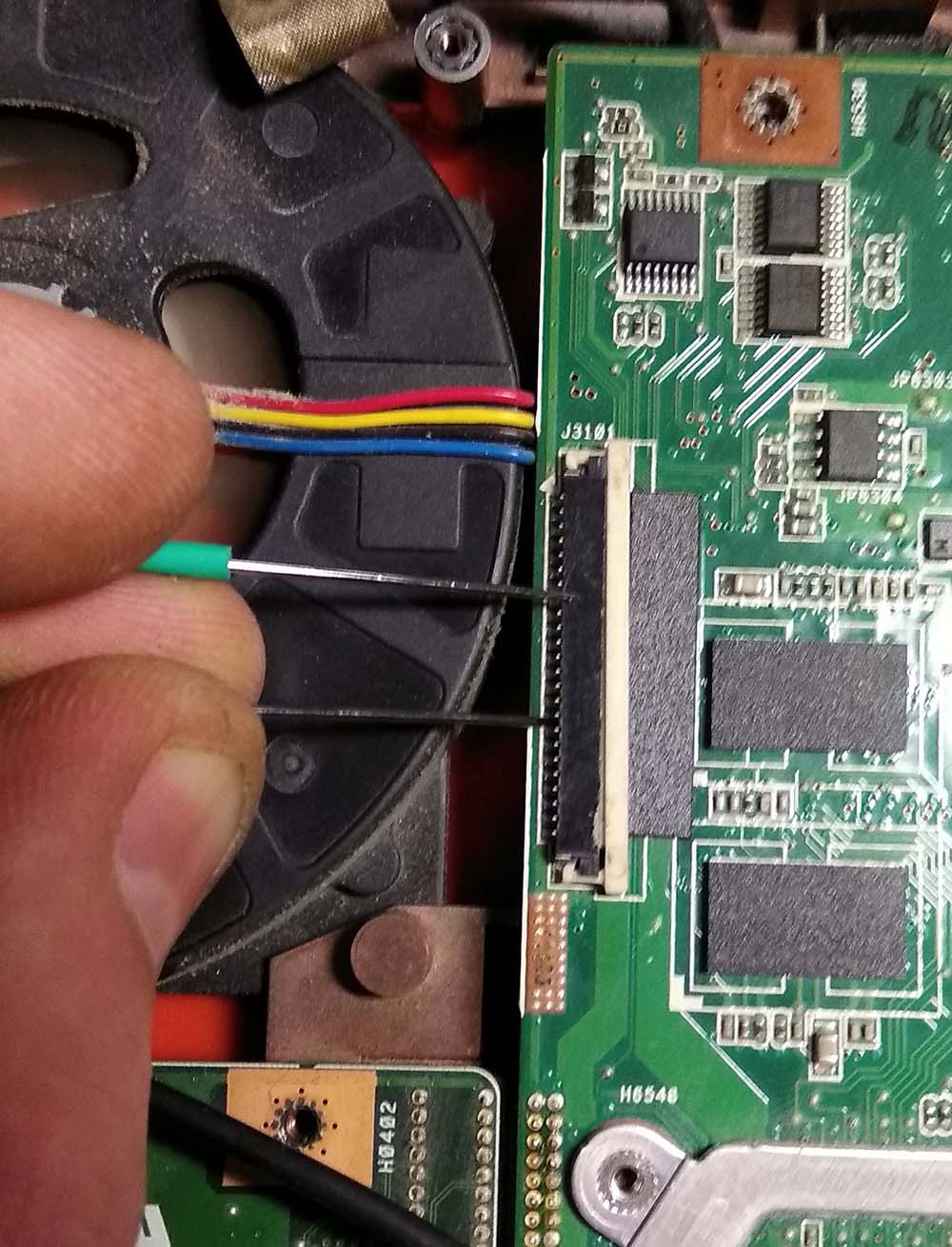 - Снимите заднюю часть. Уберите шлейф, соединяющий клавиатуру с материнской платой.
