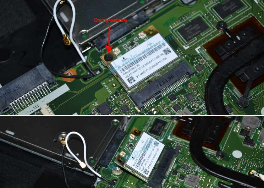 Теперь аккуратно вставляем Wi-Fi плату в разъем на ноутбуке, прикручиваем ее и подключаем антенны.