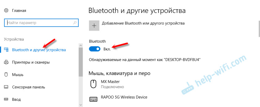 - Переходим в раздел «Устройства», на вкладку «Bluetooth и другие устройства». Если такой вкладки у вас нет, или не удается включить Bluetooth, отображается какая-то ошибка, то смотрите следующий способ. Это значит, что на вашем компьютере нет поддержки Bluetooth, или не установлены драйверы. Если поддержка есть и все настроено, то вы увидите примерно такое окно (в котором можно подключить нужные устройства):