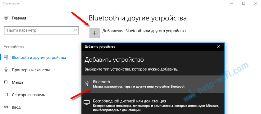 Нажмите на «Добавление Bluetooth или другого устройства» и выберите соответствующий пункт в следующем окне.