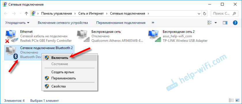 - Щелкнуть ПКМ на «Сетевое подключение Bluetooth», после чего нажать «Включить».