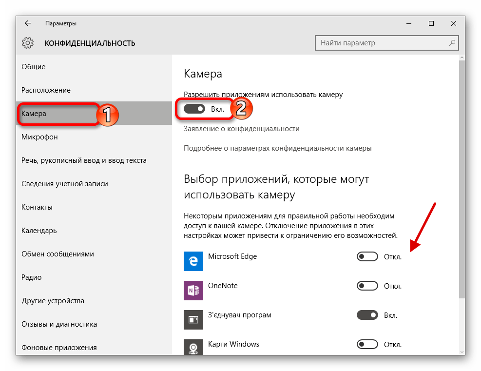 - Найдите службу «Камера» и переведите бегунок на отметку «Вкл.».