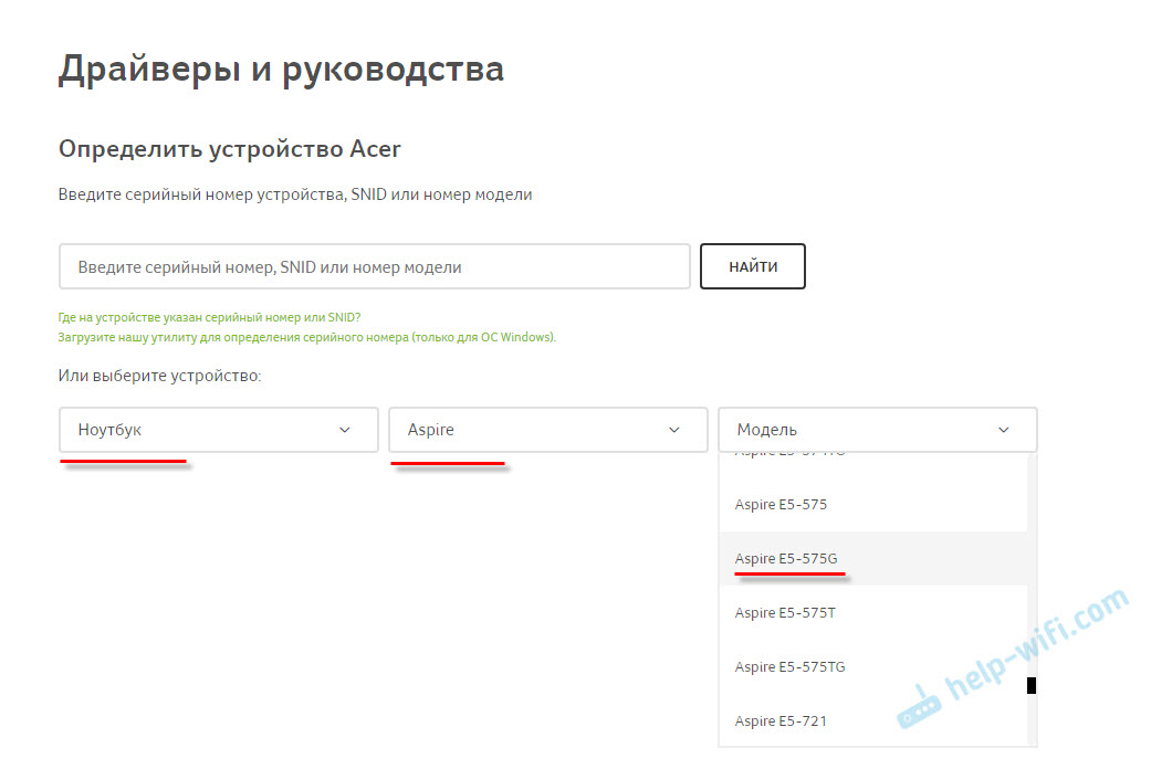 - В поле поиска ввести модель своего ноутбука Acer, серийный номер, или SNID. Эту информацию можно посмотреть снизу ноутбука, на наклейке.