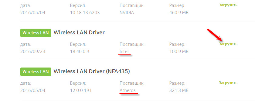 Ищем в списке необходимый драйвер. Тот который на Wi-Fi, скорее всего будет называться Wireless LAN Driver. Для сетевой карты – LAN Driver. Чтобы скачать его, просто нажмите на ссылку «Загрузить».