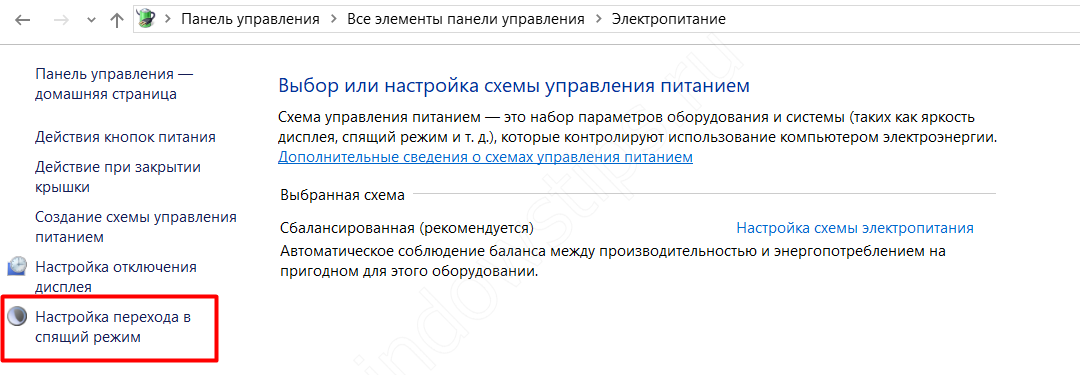 - В настройках электропитания, а именно в боковом меню, выберите «Настройка перехода…»