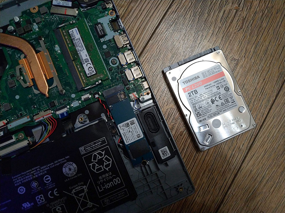 Перед использованием ноутбука сразу хотелось добавить туда дополнительный HDD на 2Tb чтобы больше туда не лазить. Заказал в Ситилинке жёсткий диск TOSHIBA L200 HDWL120UZSVA, 2ТБ, HDD, SATA III, 2.5″ толщиной 9,5мм. Диск работает тихо, вибраций на корпусе ноутбука нет. Диск отлично подошёл и крышка закрылась, но в месте где находится HDD появился легкий бугорок. Возможно из-за поролона который приклеен к задней крышке ноутбука и выступает в качестве уплотнителя. Если хотите, чтобы было в идеале, то берите диск толщиной 7мм.