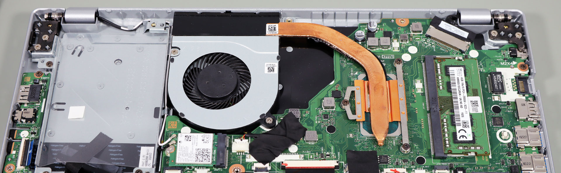 Acer went with a basic thermal design on this 14-inch Aspire 5 model, with a single fan and a thick, but fairly-short heatpipe. There’s no room for a dGPU on this implementation, even if some A514-54 listings suggest an MX450 as an option.