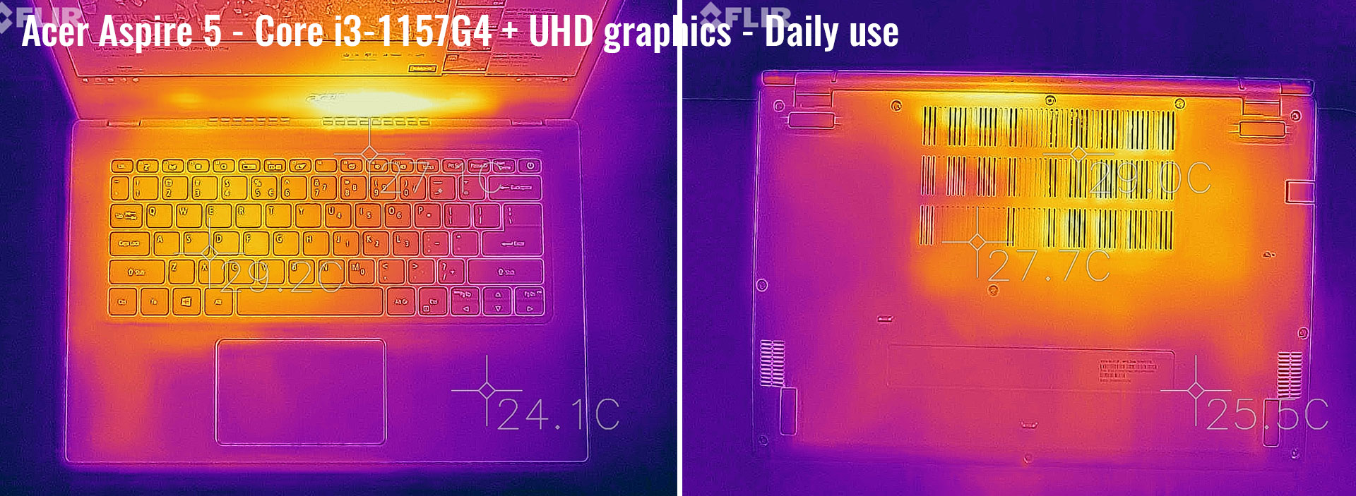 This screen’s chin is by far the hottest exterior element on this Aspire 5, both with casual use and with demanding games, as illustrated by the thermal readings down below. Keep in mind that we recorded the thermal performance in Dota2 on this sample, which limits the CPU at roughly 17W TDP, but also in FarCry 5, in which case the CPU runs at 28W and results in higher exterior temperatures and increased noise levels. However, FarCry 5 proved to be an exception in our tests, and most other games ran at 16-17W of power.