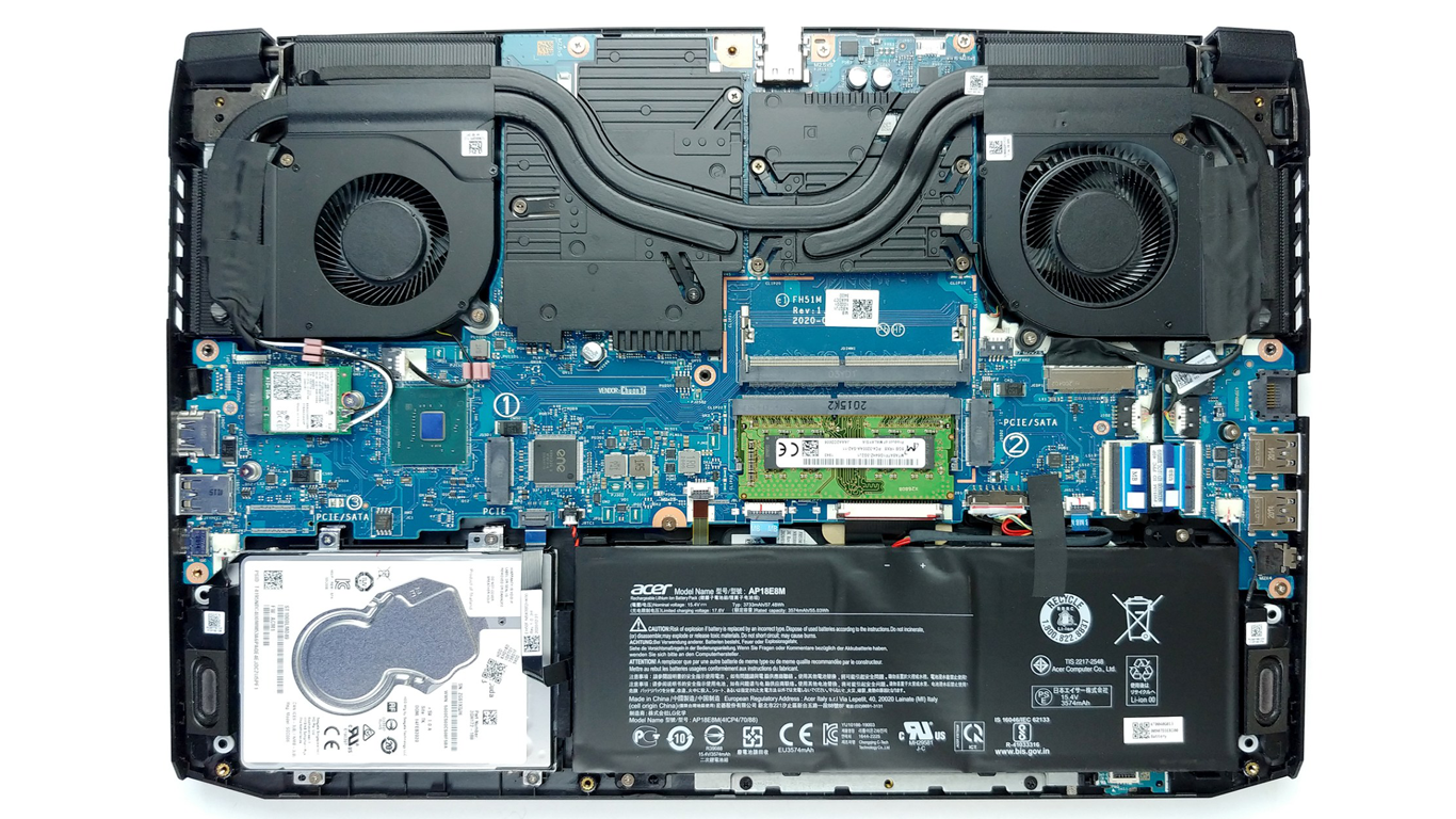 Хотя ноутбук не имеет классического люка для технического обслуживания, добраться до компонентов не составляет большой проблемы. Например, после удаления нескольких винтов достаточно старой кредитной карты, чтобы отжать защелки, которые удерживают дно, и добраться до середины устройства. Здесь можно заметить, что возможности для расширения конфигурации достаточно неплохие, поскольку Nitro 5 оборудован думя слотами SO-DIMM для оперативной памяти (до 32 ГБ), двумя слотами для накопителей M.2 с возможностью их подключения в RAID 0 и отсеком для 2 5-дюймового HDD-накопителя.