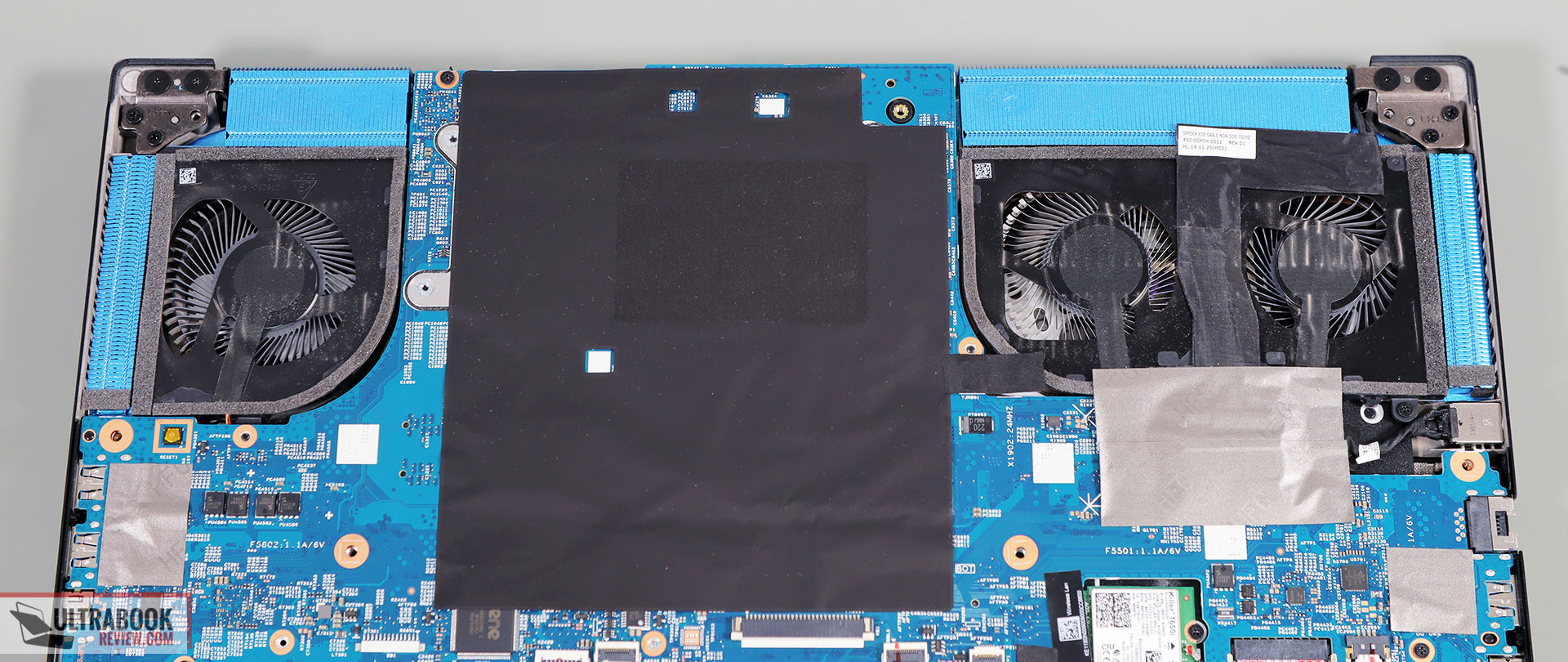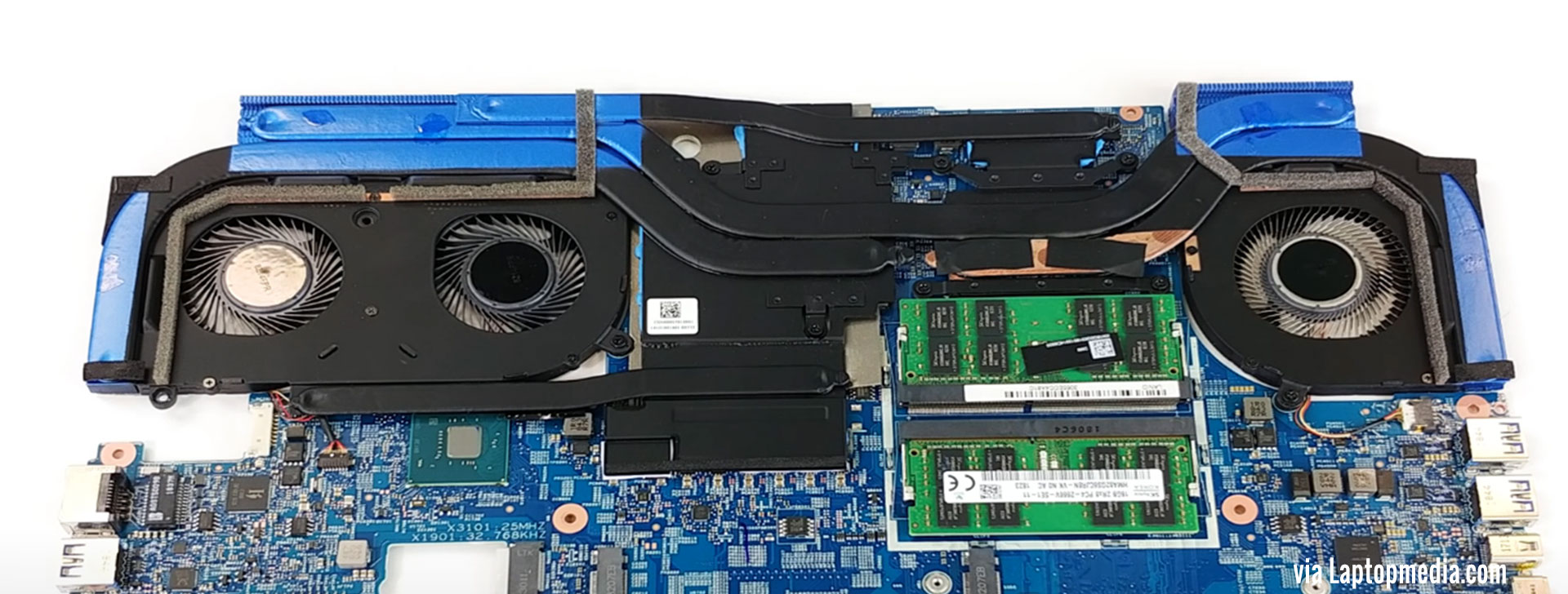 The cooling module uses three fans with Acer’s patented Aeroblade design and several heatpipes spread on top of the CPU, GPU, and VRMs. With the reversed design, you need to take out the motherboard as explained in this video from Laptomedia.com, which is also the source for the image below.