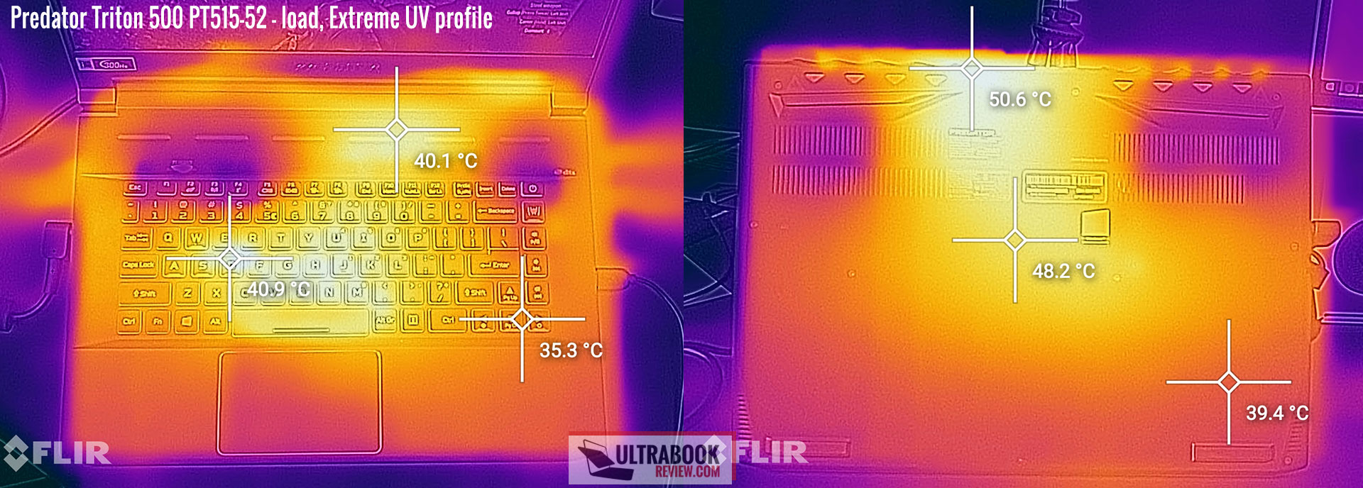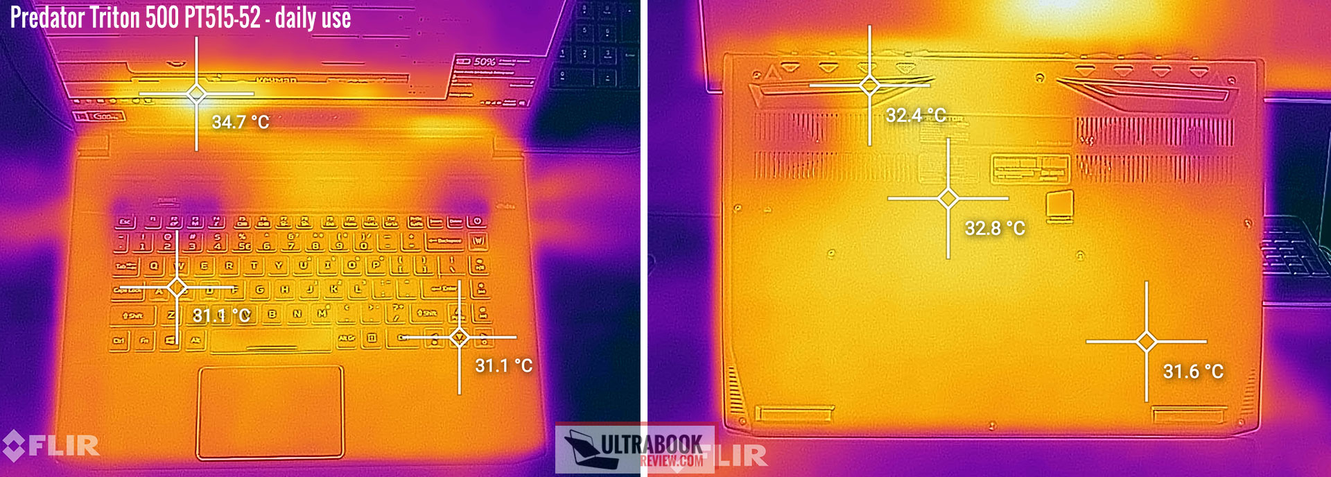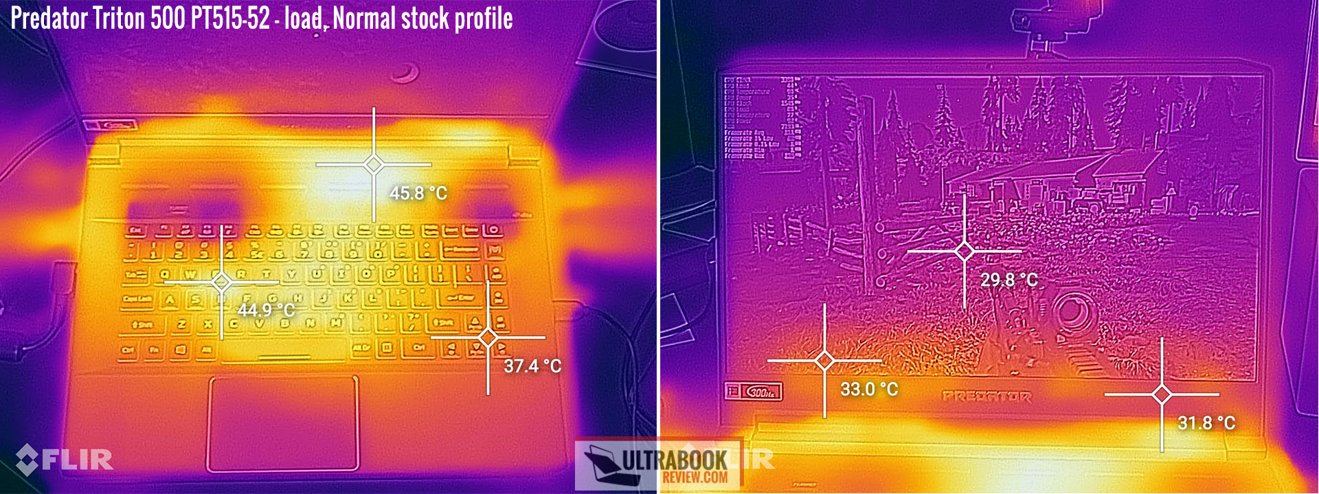 The thermal images below suggest one downside to Acer’s decision to lower the keyboard on this design. Most designs place the fans beneath the WASD region, in order to cool this commonly used set of keys. In this case, the GPU fans are placed higher and that’s causing the WASD keys to hit those higher and uncomfortable temperatures with games.