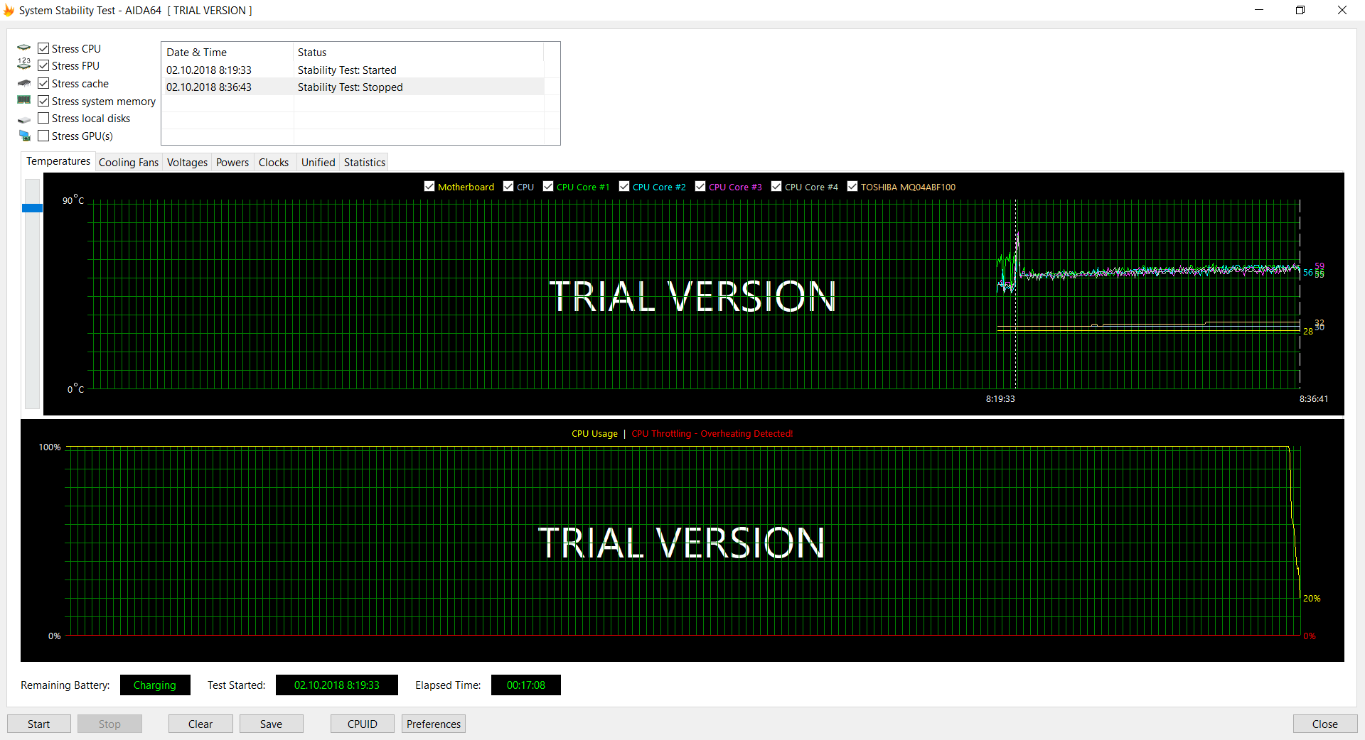 Ноутбук оснащен одним вентилятором охлаждающим две тепловые трубки, идущие от процессора. Несмотря на относительно горячий нрав Core-i7 8550U, температура процессора в стресс-тестировании не превысила 60 градусов, но и частота не поднималась выше 1,8 ГГц. В реальных задачах, вроде игр, температура могла кратковременно подскочить до 80 градусов. При этом, ноутбук ни разу не был горячим на ощупь, а самым теплым местом была правая верхняя часть подладонной панели (и именно теплым, а не горячим). Там же находится и решетка для выхода горячего воздуха, а забор холодного осуществляется снизу.