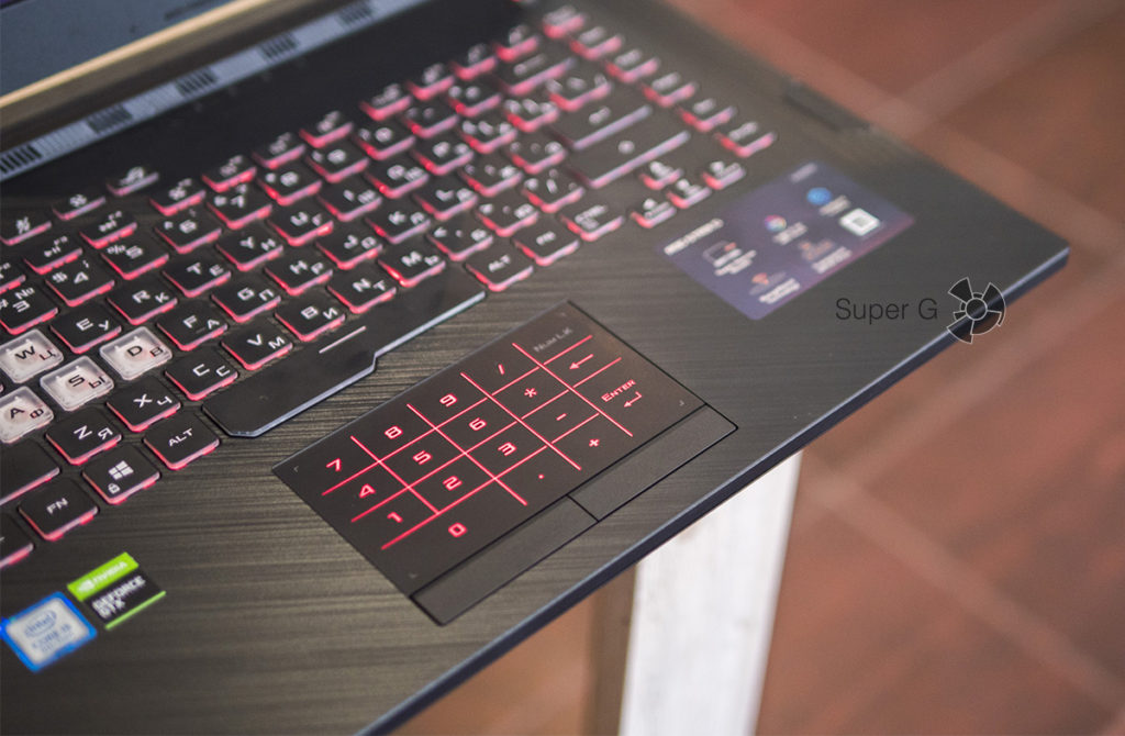 А на тачпаде можно включить сенсорную цифровую панель Num Lock — она подсвечивается только красным. Кстати, механические кнопки тачпада очень тихие и имеют глубокий, легкий ход, так что ими удобно и приятно пользоваться даже в играх. Единственный нюанс: велик риск случайно задеть пальцем и активировать Num Lock, и тогда тачпад автоматически перестает реагировать. Во время игры это может быть критично. Правда, тачпад в игровом ноуте можно отключить в одночасье и навсегда.