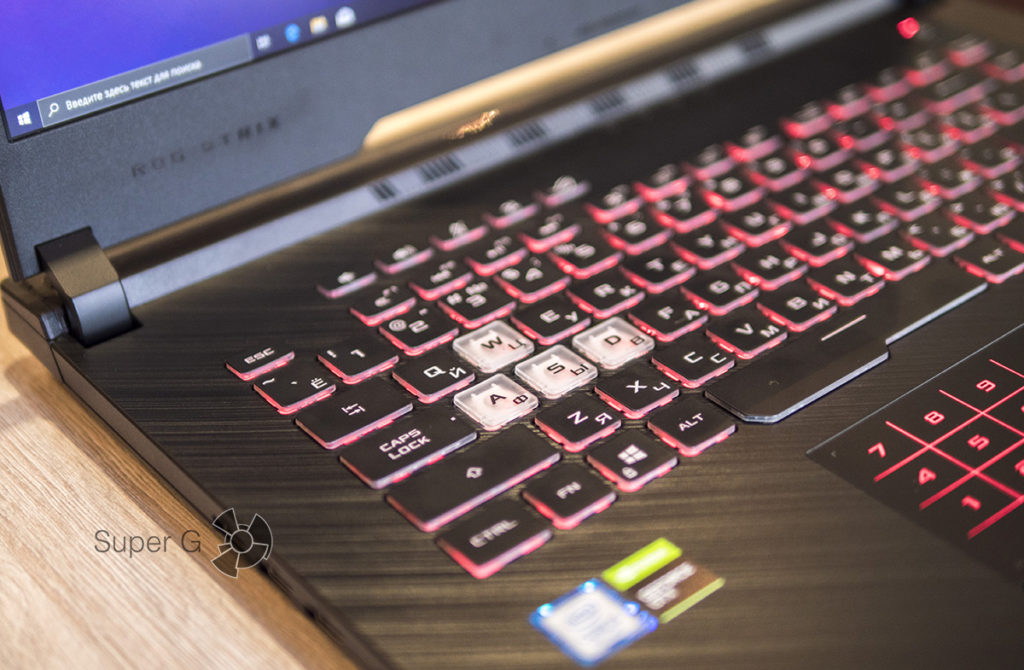 Самый дешевый — не значит некрасивый. ASUS создавали свой ROG Strix G в сотрудничестве с дизайнерами BMW, поэтому ноутбук получился стильным и по-настоящему игровым. Черный матовый корпус сочетается с большим количеством разноцветной RGB-подстветки: на клавиатуре и по всему периметру. У меня на руках тестовый инженерный образец, так что последняя не работает.