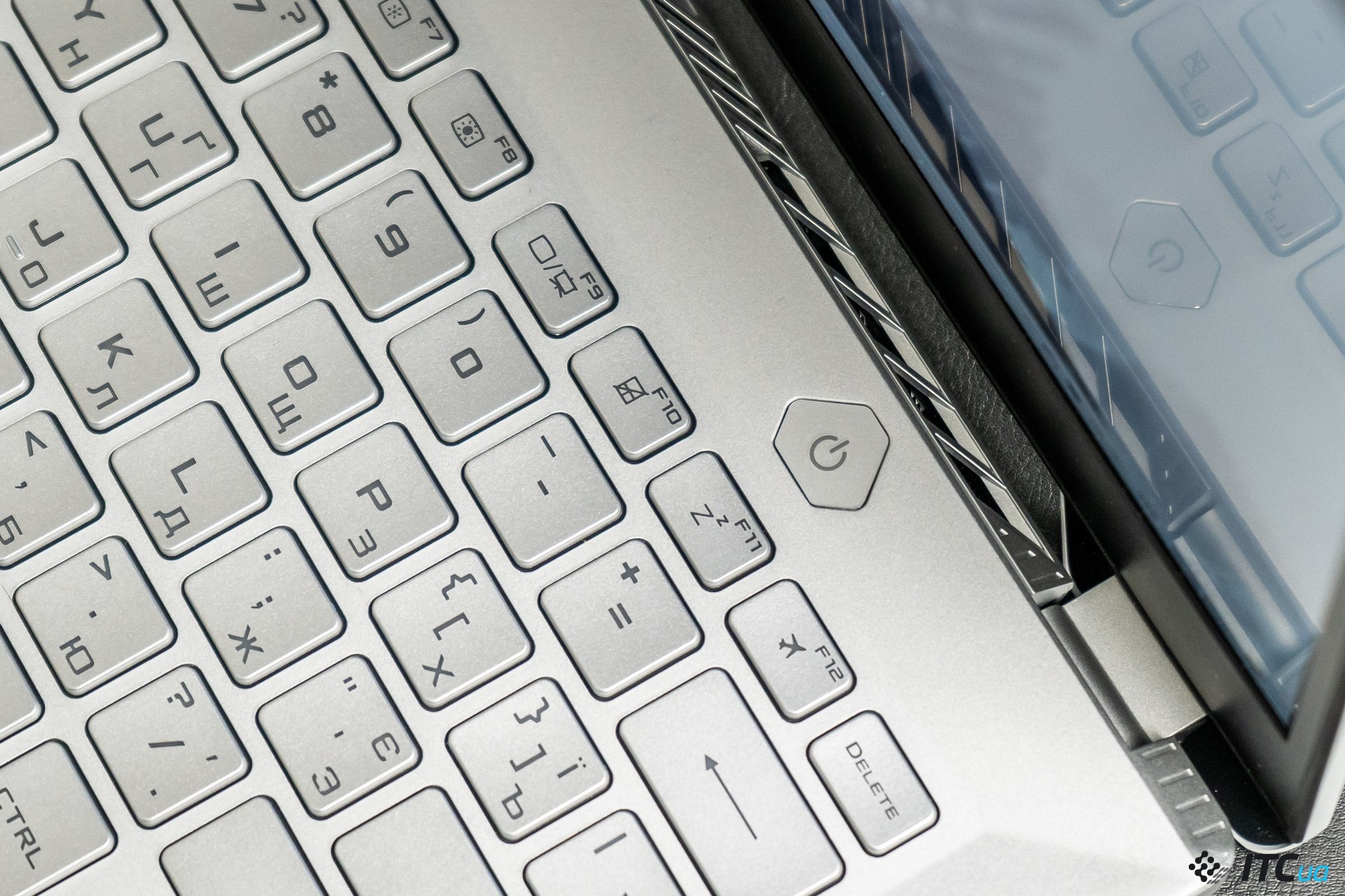 Практически на всю ширину основы корпуса нанесена клавиатура с отдельным рядом клавиш для управления звуком, отключения микрофонов и вызова программы ROG Armoury Crate. Правее от них находится кнопка включения, прикрытая стеклом, в которую вписан сканер отпечатков пальцев. Его можно использовать вместо пароля для логина в систему через Windows Hello. К слову, работает сканер отлично.