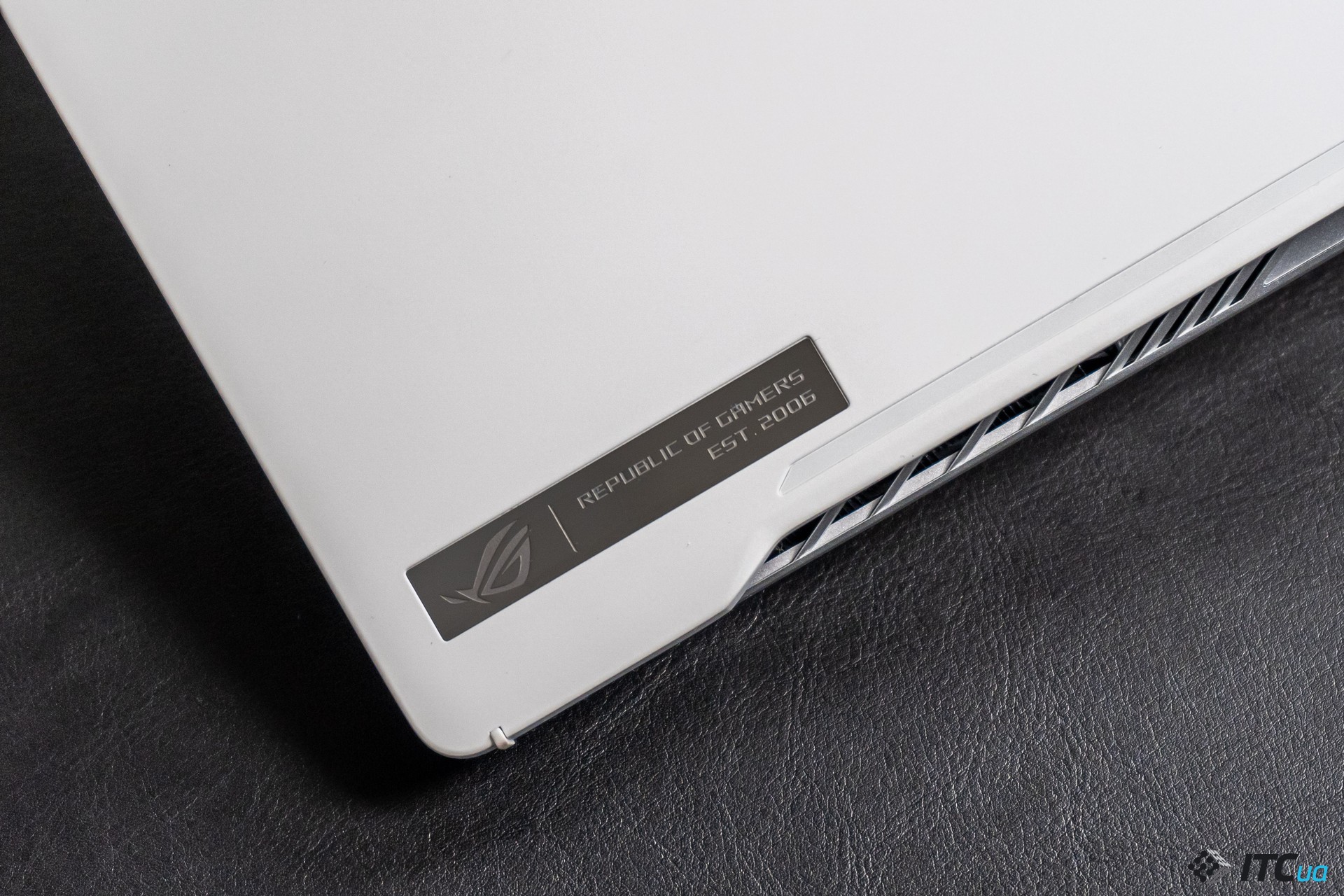 Возвращаясь к крышке дисплейного блока, хочется также отметить, что кроме точечного узора на ней нет крупных логотипов и надписей, все они вынесены на небольшую металлическую пластину в левом нижнем углу. Здесь находится логотип и надпись Republic of Gamers. Как по мне, то получилось очень стильно.
