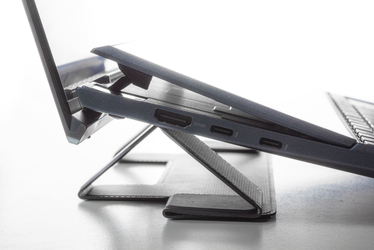 «Подиум» поднимает нижнюю часть ноутбука, тем самым делая два дела: клавиатура удобнее кладётся под руки, а второй экран поднимается ещё сильнее и информацию на нём лучше видно.