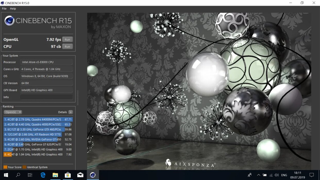 В тестах результаты Atom X5-E8000 почти сравнимы с двухъядерным Celeron N3350, который часто попадается в бюджетных ноутбуках: 838 баллов в PCMark 10, 2416 в GeekBench 4, 97 баллов в CineBench R15 и 7 fps в тестовой сцене на графику от того же CineBench R15. Но как-то мучать ноутбук бенчмарками нет смысла, с ним и так все понятно.