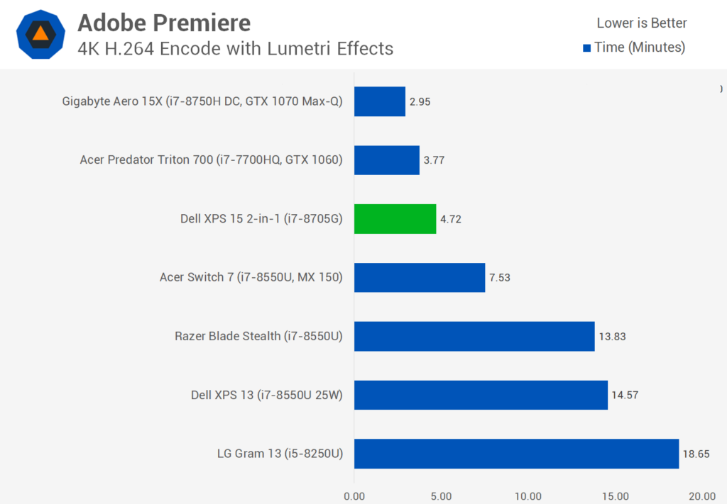 В смешанных рабочих нагрузках мы начинаем хорошо разбираться в том, как комбинация CPU и GPU складывается. При ускорении кодирования Premiere с эффектами Lumetri 8705G сильно конкурирует с игровыми ноутбуками, которые собирают более быстрые графические процессоры. Комбинация 7700HQ и GTX 1060 не наблюдается в тонких и легких ноутбуках, таких как Dell XPS 15 2-in-1, но Kaby Lake G здесь всего на 20 процентов медленнее.