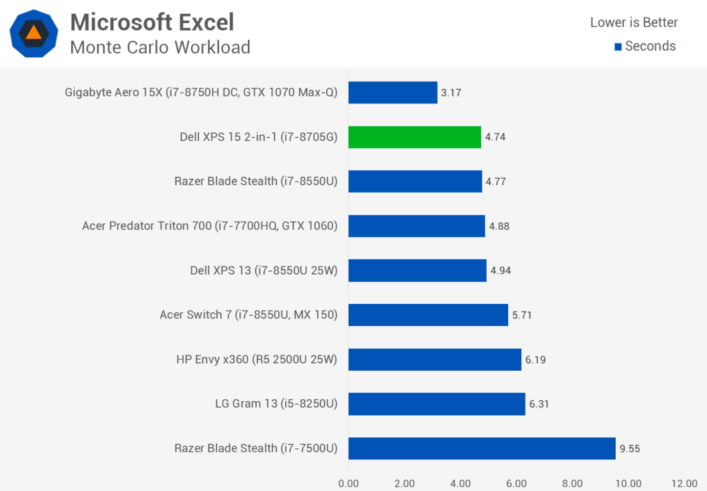 В Microsoft Excel 8705G на 3 процента быстрее, чем 7700HQ, но падает на 33 процента по сравнению с 8750H. Опять же, это связано с тем, что 8750H имеет больше ядер, что является большим преимуществом в большинстве современных многопоточных рабочих нагрузок.