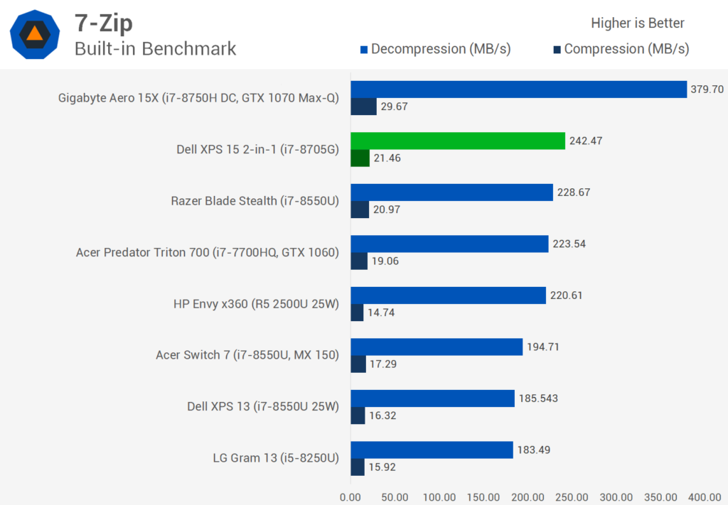 8705G имеет удобное преимущество в производительности в тестах сжатия и декомпрессии 7-Zip на 13 и 8 процентов соответственно. Однако еще раз, 8750H приходит и разбивает 8705G, достигая на 38 и 57 процентов больше производительности в этих тестах. Здесь есть довольно четкая тенденция, и это не та, которая благоприятствует Kaby Lake G над Coffee Lake H.