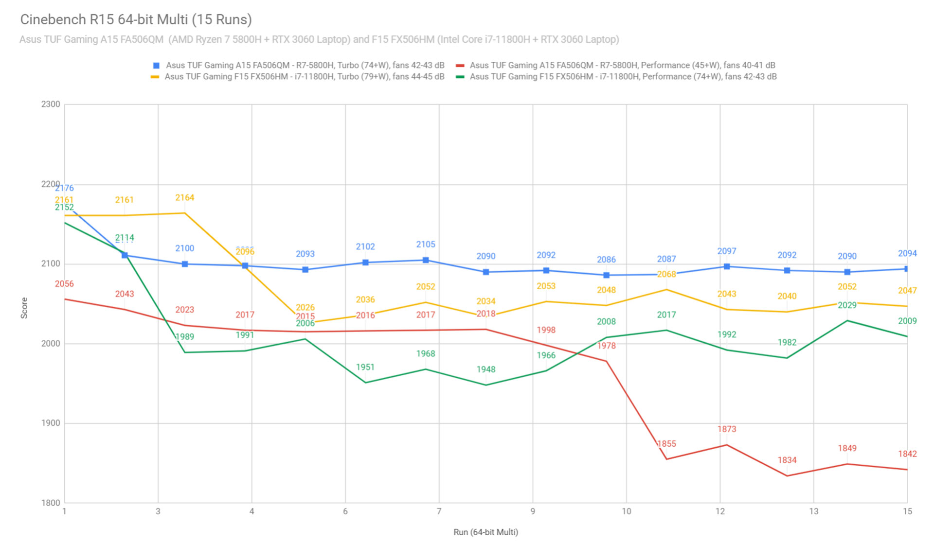 So with that out of the way, we’ll first touch on the sustained CPU performance in the Cinebench loop test, which runs the same test for 15+ times in a loop, with 1-2 sec delay between each run.