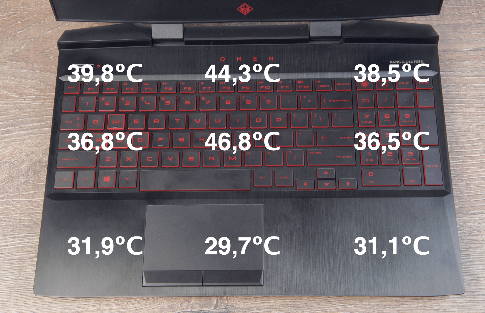 Под нагрузкой температура ядер процессора в среднем не превышает 82,8 градусов Цельсия, а корпус максимально нагревается до 46,8 градусов Цельсия по центру клавиатуры.