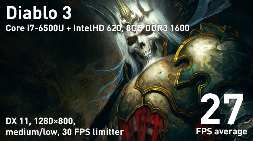 В Diablo 3 и Overwatch количество кадров находилось в пределе 30 в секунду, что очень неплохо для встроенного графического ядра при невысоком разрешении в 1280 × 720 px.