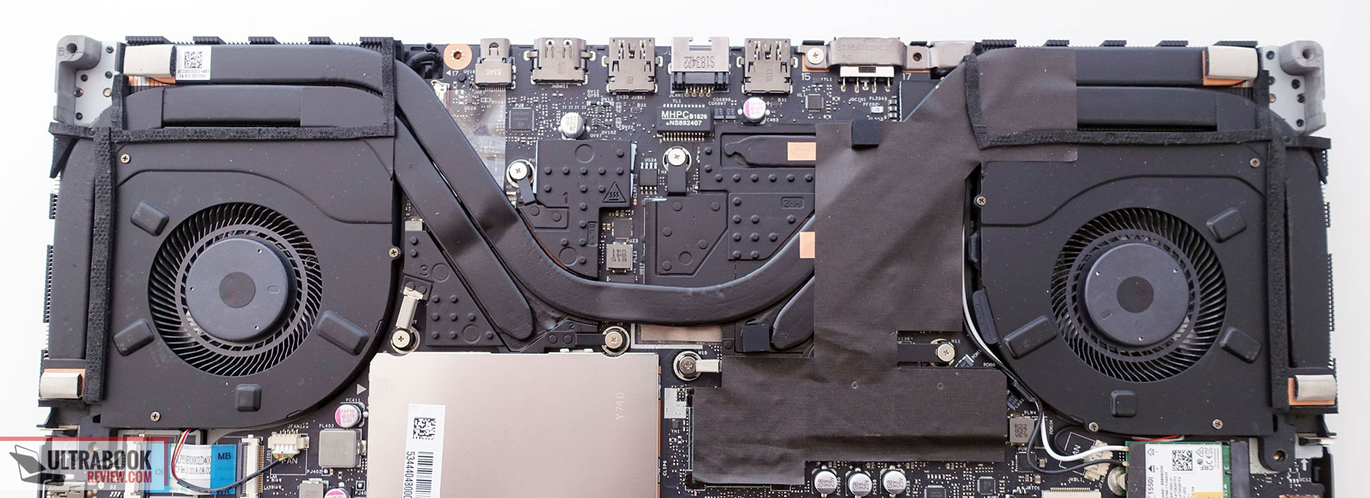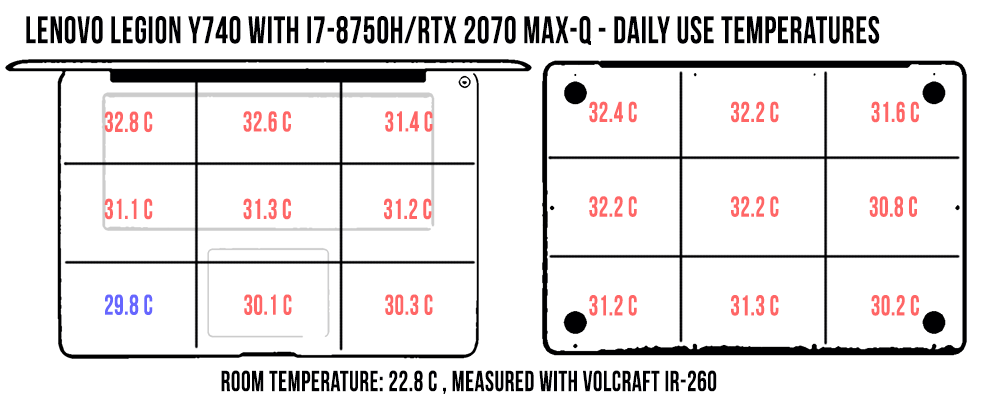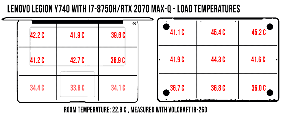 As a result, the cooling solution does a good job at keeping the exterior cool, even if the CPU averages high temperatures, as explained in the previous section. The keyboard deck only reaches temperatures in the low-40s with gaming, while the bottom hits mid-40s, and the fans are only moderately noisy, peaking at around 46-47 dB at head-level at their maximum speeds.
