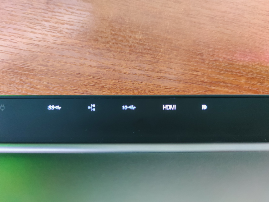 Спереди никаких вырезов нет, но открыть ноутбук всё равно можно легко и одной рукой. Раскрывается он, кстати, на 180°. Все остальные порты расположены сзади. По краям — ещё пара решеток охлаждения, Kensington Lock, проприетарный разъем для подключения зарядки, пара USB 3.1 (Gen 2), Ethernet, HDMI и mini-DisplayPort. Разъемов хватает, но нет кардридера, что немного расстраивает.