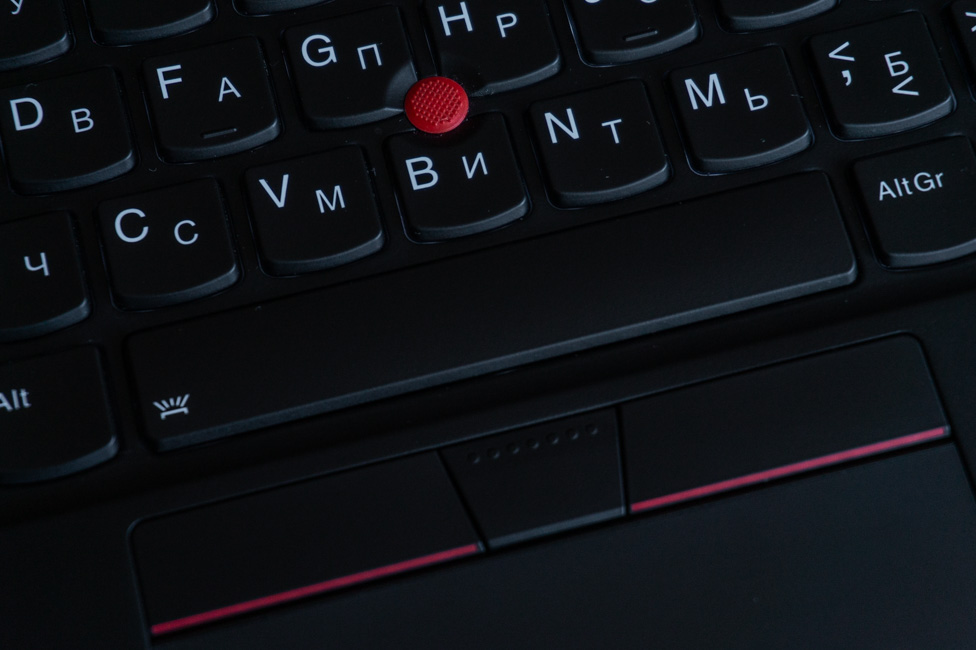 Красная пипка в центре клавиатуры — трекпоинт для точного управления, фирменная фишка ThinkPad уже много лет, без неё нельзя представить Carbon. Даже если вы и не будете ей пользоваться, всё равно она будет радовать глаз, такого вы не встретите ни в HP, ни у ASUS. Честно скажу — я пробовал к нему привыкнуть, но так и не смог, не получилось. Но видимо, своя магия у этого элемента имеется, раз именно ради него выбирают ноутбуки ThinkPad.