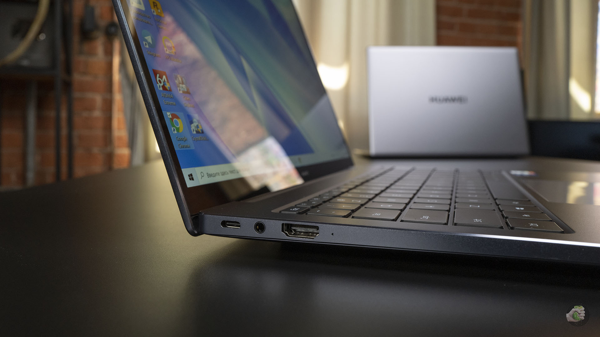 Набор портов можно считать достаточным. Слева мы видим цилиндрический разъём для зарядки, полноразмерный выход HDMI на монитор или телевизор, USB 3.0, USB-C, комбинированный 3,5-мм разъём для гарнитуры.