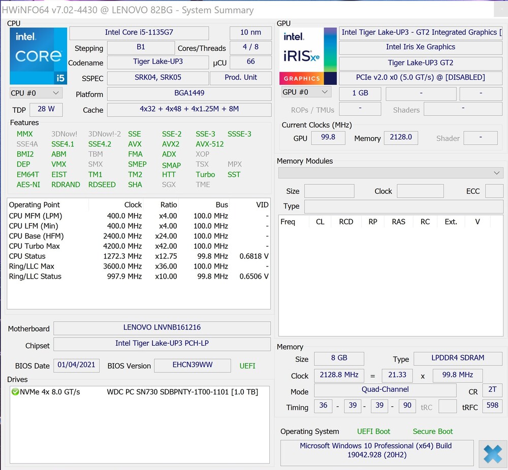 У меня на тесте топовая комплектация с четырёхъядерным (8 потоков) Intel Core i7-1165G7 c графикой Intel Iris Xe G7 96EUs. Каждое ядро процессора способно работать на частоте до 2,8 ГГц. Его основным конкурентом считается AMD Ryzen 7 4800U.