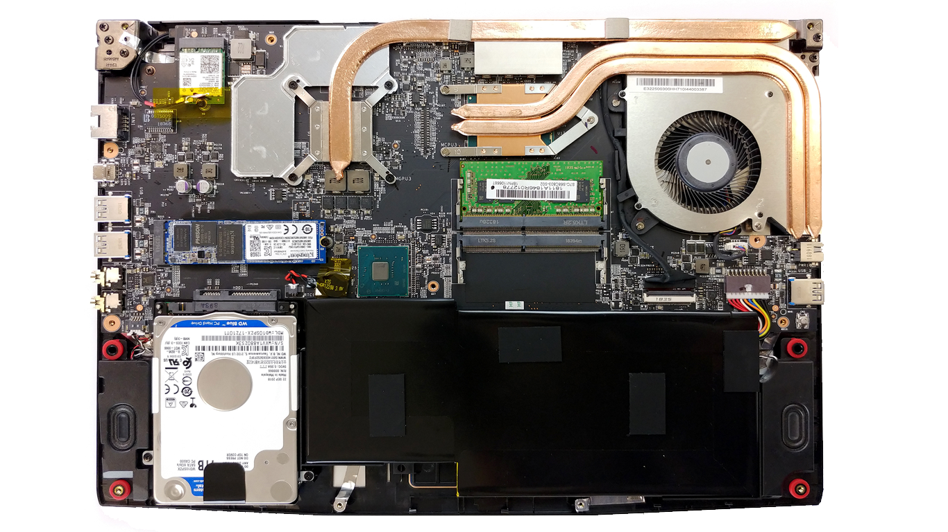 Нижняя крышка удерживается 12 винтами и на одном из них есть гарантийная пломба. После снятия крышки пользователю открывается доступ к системе охлаждения, разъемам накопителей, слотам под память DDR4 (всего их два) и адаптеру WiFi.