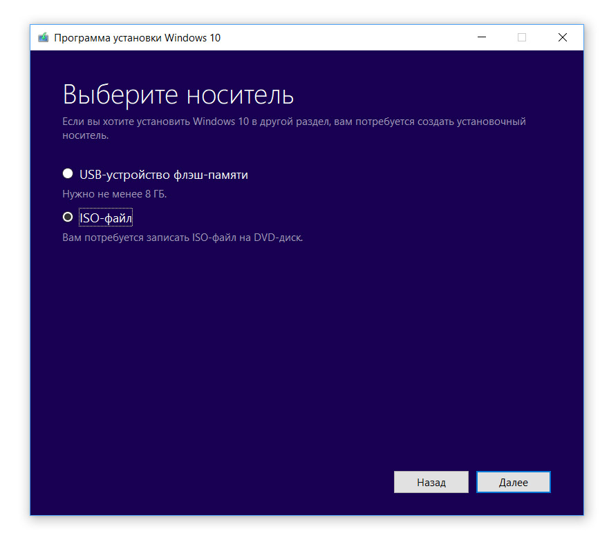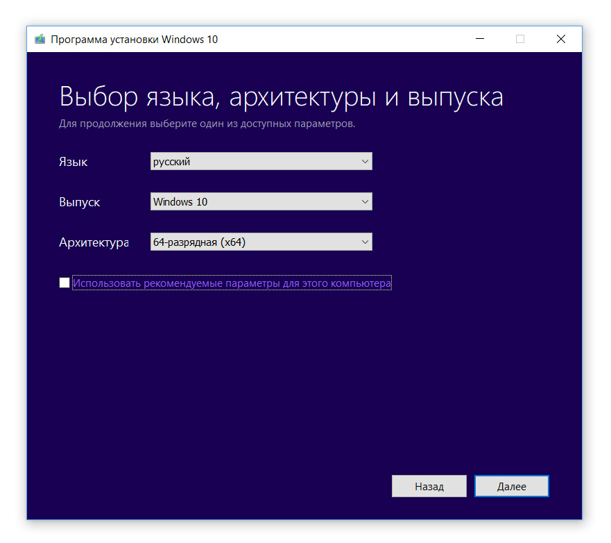 Открываем Media Creation Tool, выбираем пункт «Создать установочный носитель для другого компьютера», в следующем окне снимаем установленную галочку и выставляем следующие параметры: «русский», «Windows 10», «64-разрядная (x64)». На третьем этапе тыкаем на «ISO-файл» и после программа начнёт скачивать систему со своих серверов в файл .ISO.