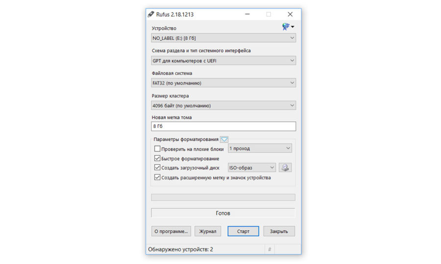 В приложении Rufus выбираем нашу флешку, схему разделов «GPT для компьютеров с UEFI», файловую систему FAT32, образ ISO, скачанный на предыдущем этапе, и ставим галочки, как на скриншоте.