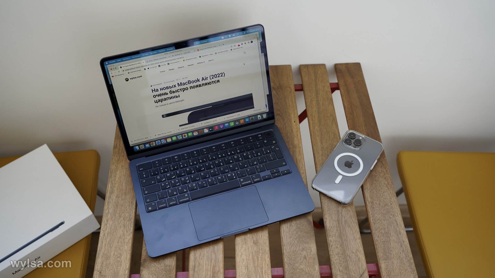 Если бы я выбирал, купил бы старый добрый Space Gray — у меня вся техника Apple именно такая. С другой стороны, что на сером, что на тёмно-синем ноутбуке довольно сильно заметны следы, и это бесит. Замучаешься чистить — поверьте, для фотографий я старался это сделать, но получилось очень плохо. Я специальными салфетками минут десять драил корпус, потом пытался навести люкс с помощью чудо-тряпок — ничего не получилось, всё равно остаются следы. Но не буду лукавить — уж лучше показать технику в боевом состоянии, чем в парадном. У вас Air будет выглядеть так же.