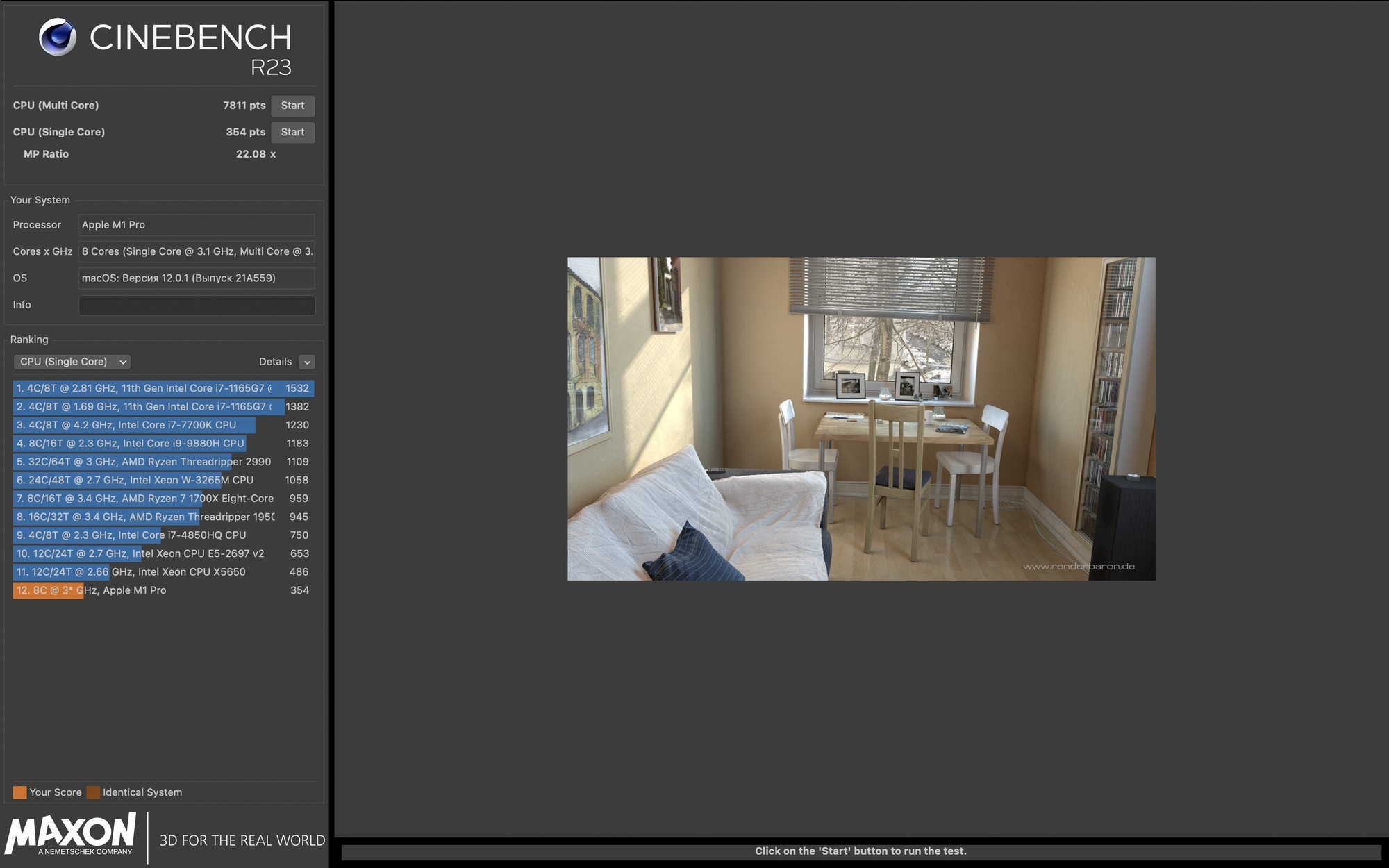 Cinebench R23 показал всего 354 в однопоточном и 7811 баллов в многопоточном тесте.