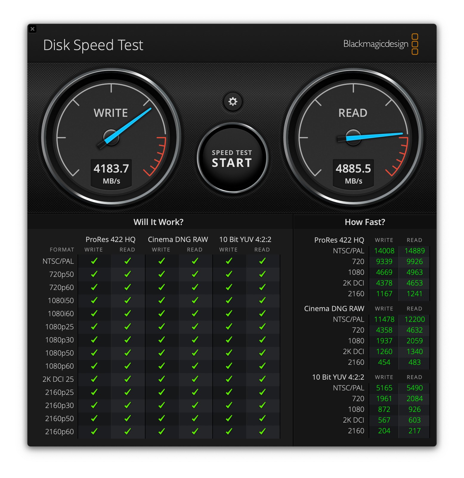 Результаты тестирования скорости работы SSD накопителей в Blackmagic Disk Speed Test: