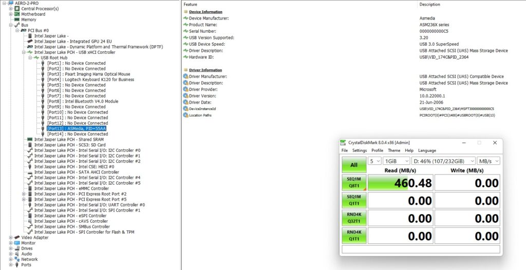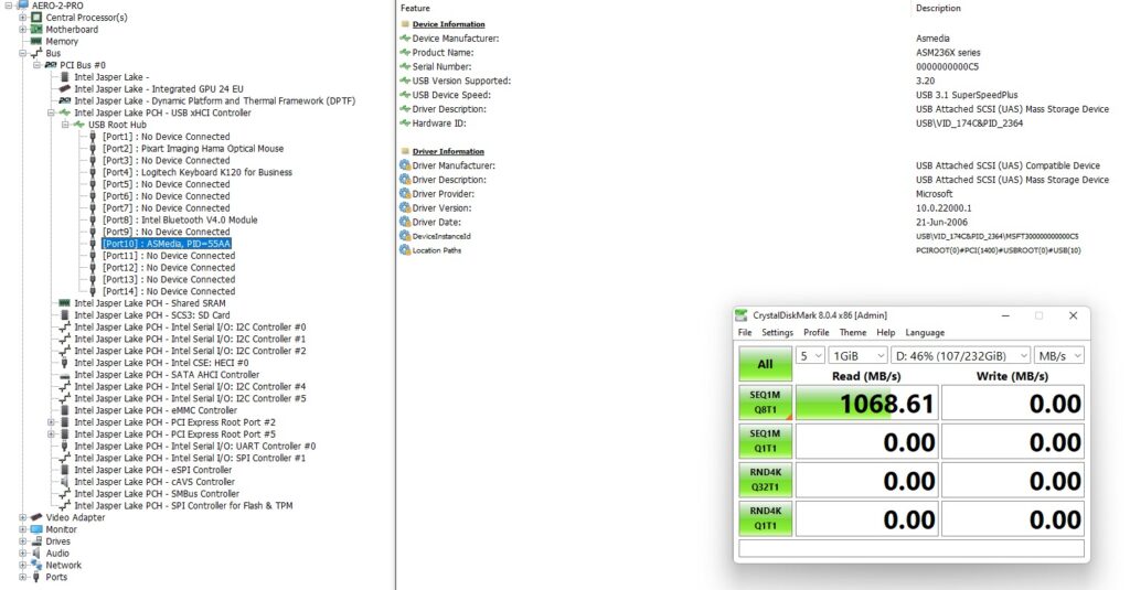 и перечисляет три USB-порта как 3.0, поэтому мы протестировали их с помощью твердотельного накопителя Samsung 980 PRO PCle 4.0 NVMe M.2, размещенного в «адаптере USB-M.2 NVMe» (корпус ORICO M2PAC3-G20 M.2 NVMe SSD), который показал что задний и второй из боковых USB-портов на самом деле были 3.1 (USB 3.2 Gen 2×1, т.е. 10 Гбит/с):