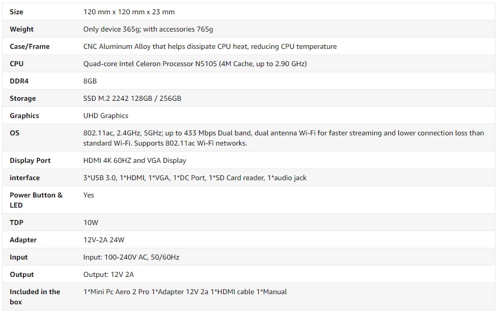 Aero 2 Pro физически состоит из прямоугольного металлического корпуса размером 120 x 120 x 23 мм (4,72 x 4,72 x 0,91 дюйма) с вставными передней и задней пластиковыми панелями. В качестве мини-ПК с активным охлаждением он использует 10-нм процессор Intel Jasper Lake N5105, который представляет собой четырехъядерный 4-поточный процессор Celeron с тактовой частотой 2,00 ГГц, повышающийся до 2,90 ГГц с графикой Intel UHD Graphics.